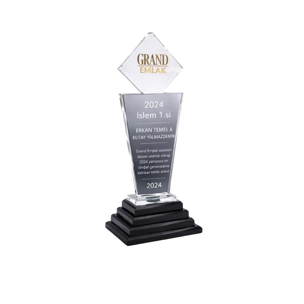 Formu gereği yükselişi ve basamakları temsil eden bu modelimiz, özellikle gayrimenkul (emlak) sektörü, satış ekipleri, inşaat firmaları ve eğitim kurumları için "altın standart" kabul edilir. "İşlem Birincisi", "Yılın En İyi Çıkış Yapan Bayisi" veya "Kurumsal Onur Ödülü" gibi kategorilerde, bu plaketin heybeti alıcı üzerinde paha biçilemez bir takdir hissi uyandırır. Üstteki kare parça, kurum logonuzu veya başarının yılını en tepede gururla sergilemenize olanak tanırken; alt gövde ise uzun teşekkür metinleri için geniş ve ferah bir alan sunar. Bu modelimizde kurumsal üretim standartlarımızı korumak adına minimum 5 adet sipariş şartı bulunmaktadır.