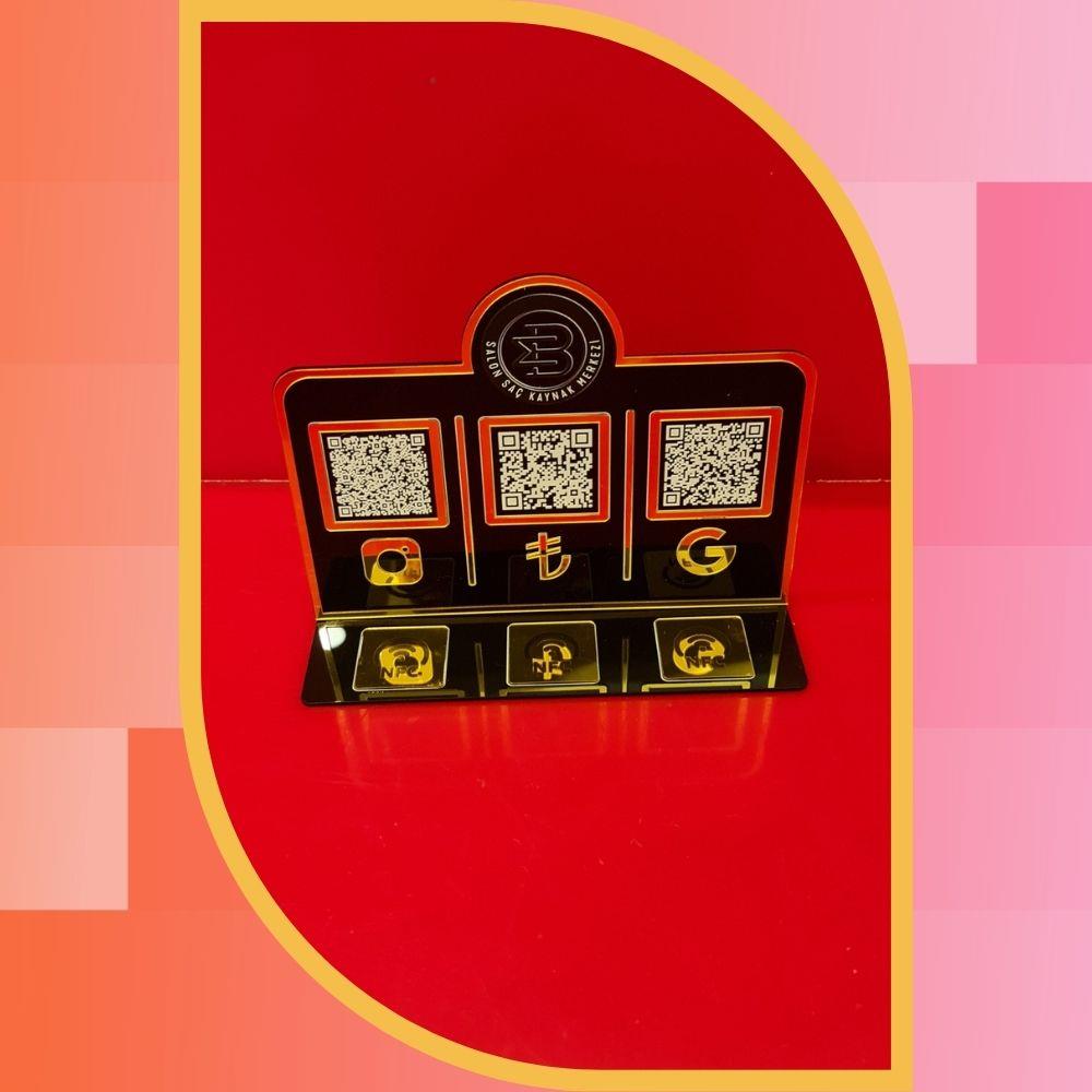 İşletmenizin kalitesi, sunduğunuz hizmetin yanı sıra masanızdaki sunum detaylarıyla ölçülür. 22x14 cm ölçülerindeki bu özel tasarım, siyah akrilik zemin üzerine işlenen Gold Pleksi detaylarla görsel bir şölen sunar. Samsun Atakum Üretim Üssü'müzde geliştirilen bu Plus model, hem fiziksel hem de dijital dünyayı en profesyonel şekilde birbirine bağlar.