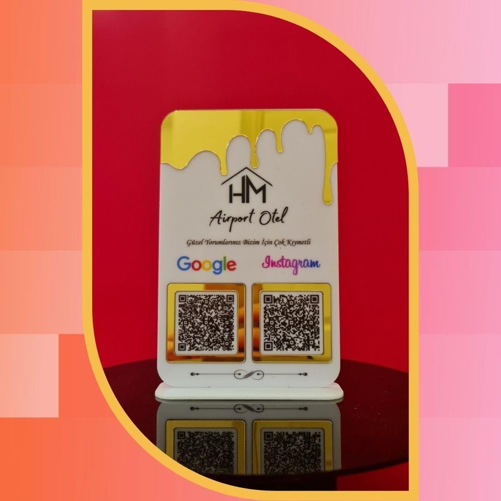 The 3 mm first-class white plexiglass material used in the body of our product gains depth with gold mirrored layers placed on it with great precision.The smooth lines obtained with our laser cutting technology represent the attention your business gives to details.Its structure consists of two main panels;On the one hand, it displays the "Google Review" area where your guests can instantly share their accommodation experiences, and on the other hand, it displays your "Instagram" profile, where they can access the most up-to-date posts of your property.Command UVhigh-resolution graphics processed by printing systems;It promises lifetime durability against liquid contact, sunlight and intensive use.